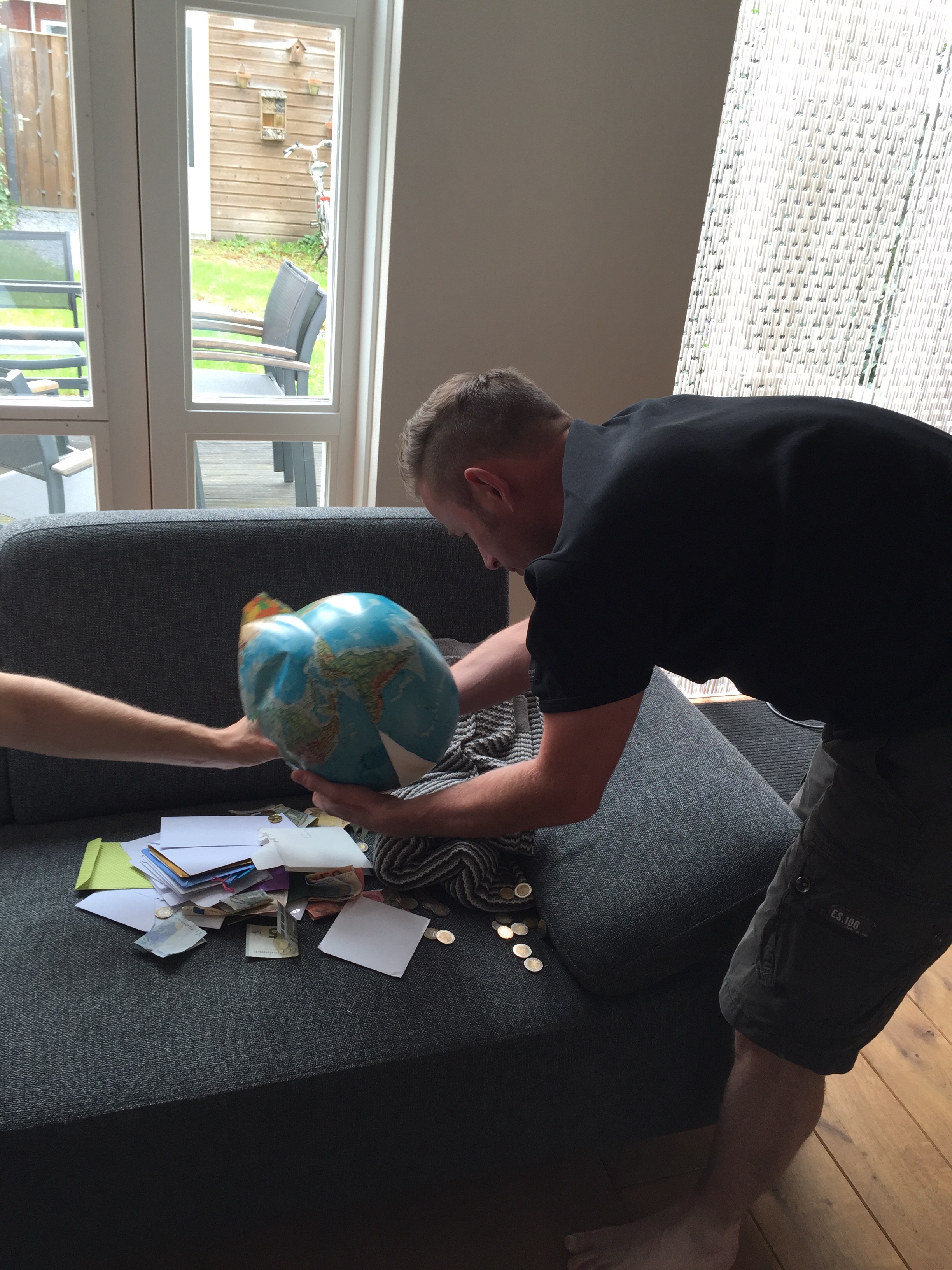 Na ons feest was het tijd voor het tellen. De wereldbol moest eraan geloven. Nadat de dremel zijn werk had gedaan. kwamen er heel wat enveloppen uitgevallen.