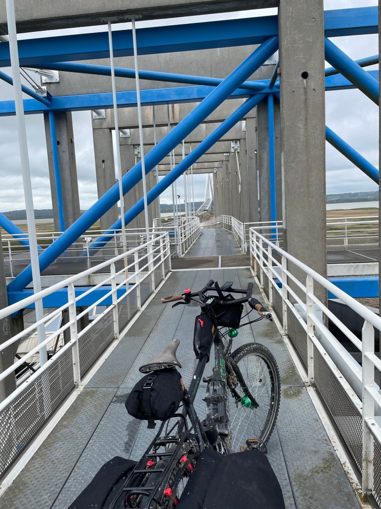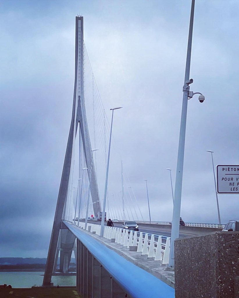 We moesten de Seine oversteken om in Honfleur te komen. Nog nooit zijn we zo’n lange, hoge brug overgestoken op de fiets.