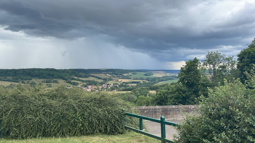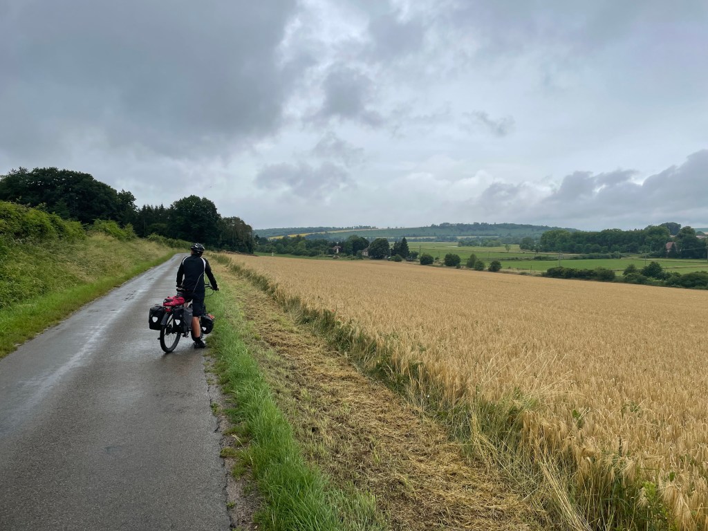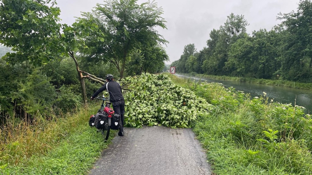 Het weer. Op de fiets ben je heel erg afhankelijk van het weer. Ieder zuchtje wind, iedere druppel voel je. Persoonlijk vind ik zo’n 23 graden met een zonnetje ideaal. Deze vakantie hebben we bijna alles gehad. Regen, wind, onweer, hittegolf. Wij kamperen, dan merk je de elementen misschien nog wel meer. Het onweer kwam zeer dichtbij. Enorm harde knallen en flitsen rondom ons tentje. Best een beetje eng. De laatste dagen hebben we helaas regelmatig een nat pak gehaald.